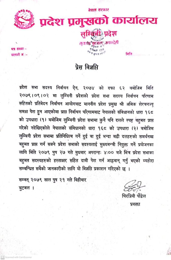 प्रदेश प्रमुखको कार्यालयबाट जारी सूचनामा भनिएको छ, ‘निर्वाचन परिणामबाट नेपालको संविधानको धारा १६८ को उपधारा (१) बमोजिम लुम्बिनी प्रदेश सभामा कुनै पनि दलले स्पष्ट बहुमत प्राप्त गरेको नदेखिएकोले नेपालको संविधानको धारा १६८ को उपधारा (२) बमोजिम लुम्बिनी प्रदेशसभामा प्रतिनिधित्व गर्ने दुई वा दुईभन्दा बढी दलहरूको समर्थनमा बहुमत प्राप्त गर्न सक्ने प्रदेशसभाको सदस्यलाई मुख्यमन्त्री नियुक्त गर्ने प्रयोजनका लागि मिति २७ पुस ०७९ बुधबार अपरान्ह ४ :०० बजेभित्र प्रदेशसभाका बहुमत सदस्यको हस्ताक्षरसहित दावी पेश गर्न आह्ववान् गर्नु भएको व्यहोरा सम्बन्धित सबैको जानकारीको लागि विज्ञप्ति प्रकाशन गरिएको छ ।’