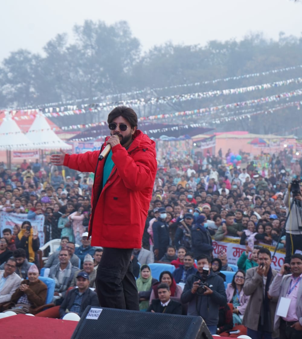 कता हिँडेको बैनी हट बनेर…पट भएर…ब्युटी भएर…भन्दै गायक दुर्गेग थापा रातो ज्याकेट, कालो चस्मा र कालो मास्क लगाएर बडो फुर्तिलो साथ स्टेजमा देखिए । पछिल्लो समयको युटयुब टेन्डिङ गीत दुस्मन हेरेको हे¥यैबाट स्टेज उक्लेका दुर्गेश थापाको क्रेजमा चौरमा युवायुवती निकै झुमेका थिए । गीत गाउँदा गाउँदै उनले सुरुमा मास्क र पछि ज्याकेट पनि फुकाले । दर्शकबाट वान्स मोर भनेपछि यही एउटा गीत उनले तीन पल्ट गाएर दर्शकलाई नचाएका थिए । उनले क्षेत्रीको छोरो हिरो छ….,हामी पनि नाच्नुपर्छ बीच्चबीच्चमा…लगाएका गीतहरु पनि उत्तिकै उर्जाका साथ गाएका थिए ।